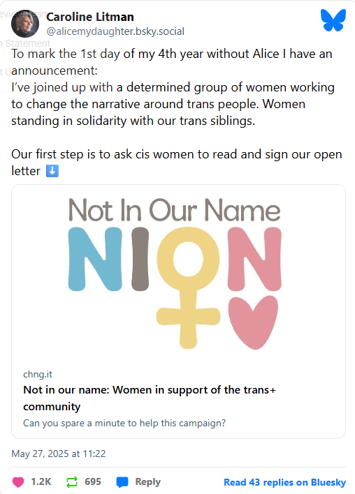 On the afternoon of Tuesday, the 27th of May 2025, Caroline Litman, author and mother of trans woman Alice Litman, who sadly took her own life in May 2022, aged just 20, made a historic post on Bluesky. It read
